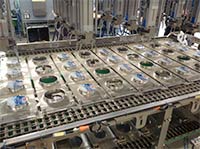 4-bahnige Anlagenkonfiguration. Für die flexible Abfüllung verschiedener vorgeformter Becher mit UVC Sterilisationseinheiten für Becher und Platine sowie einer Reinraumsterillufthaube.